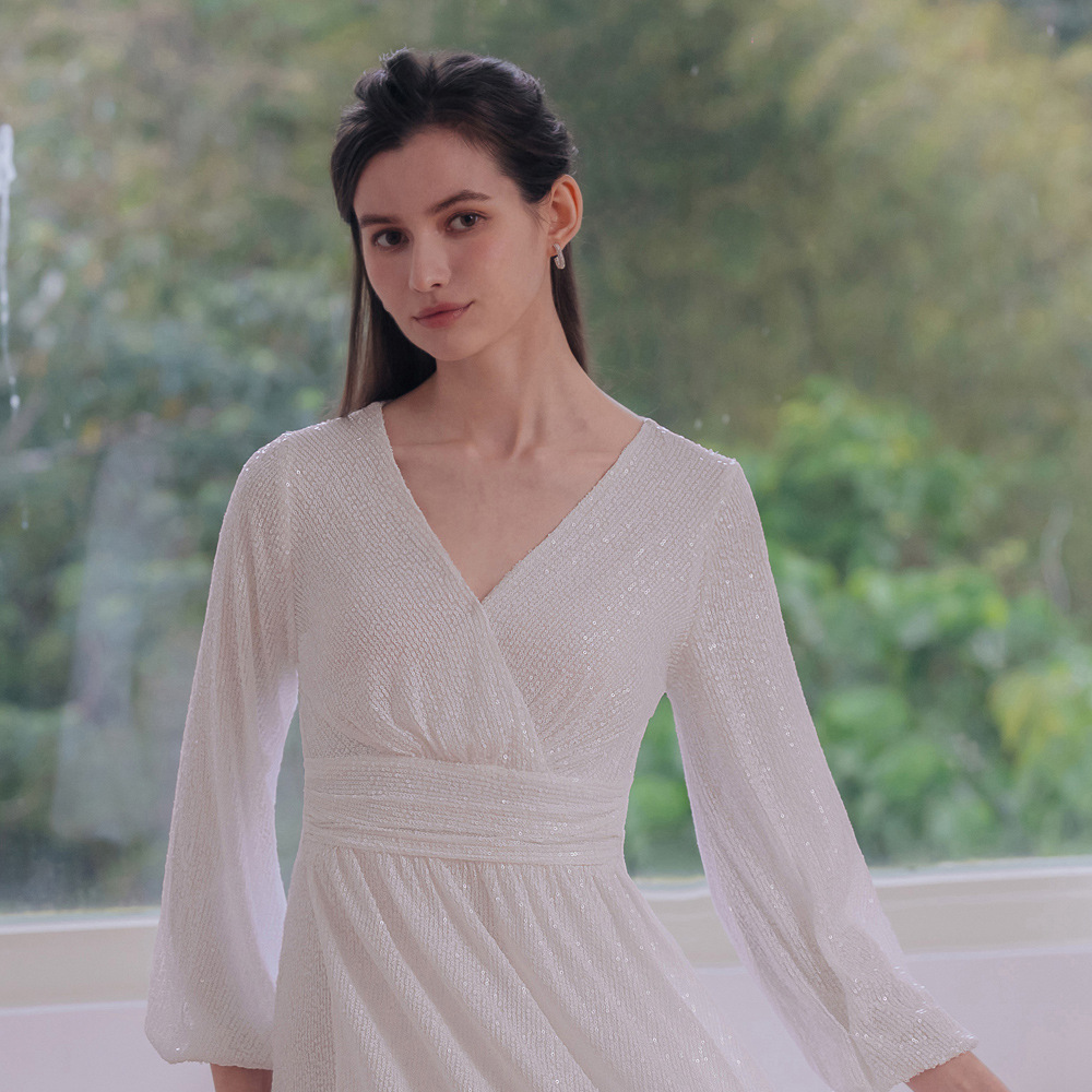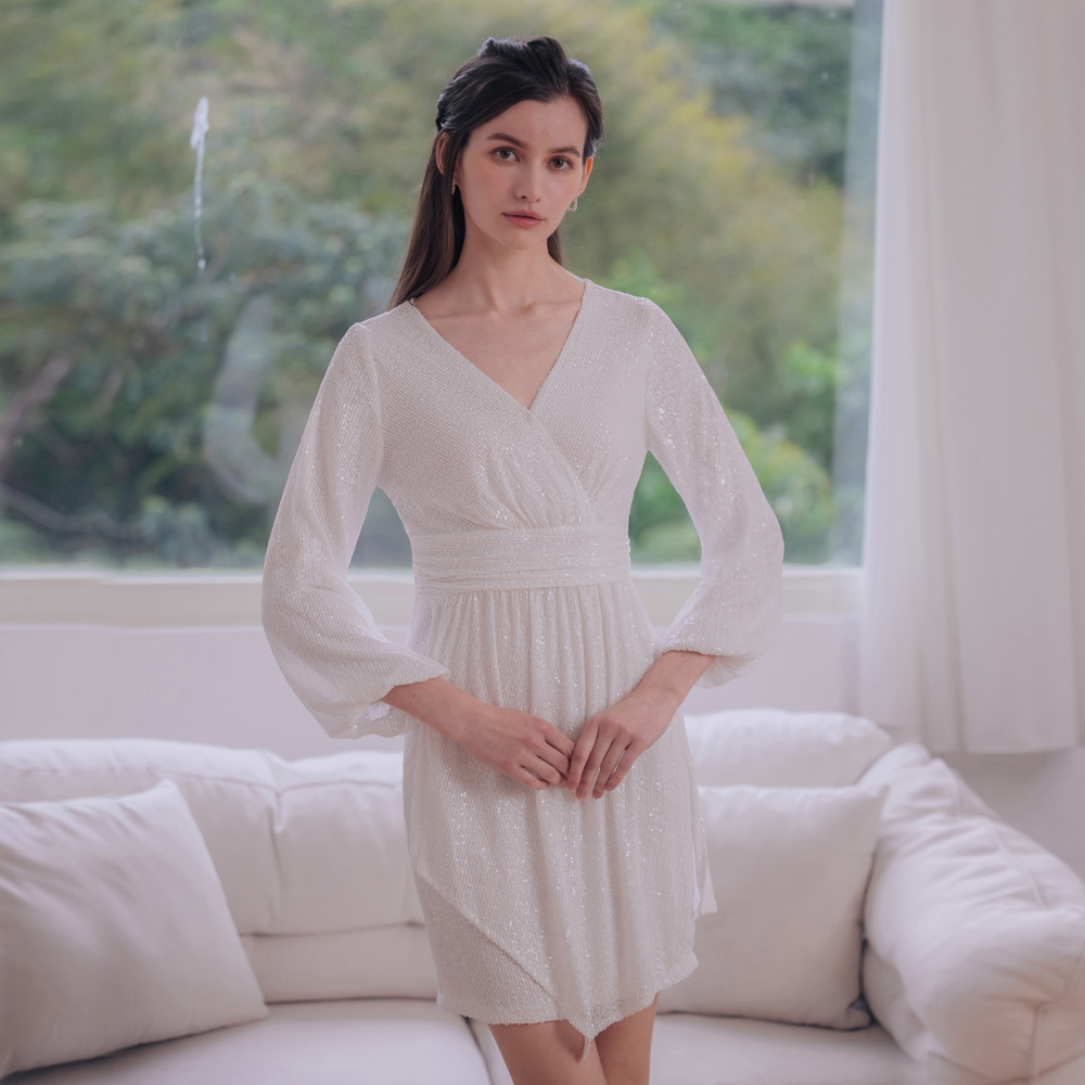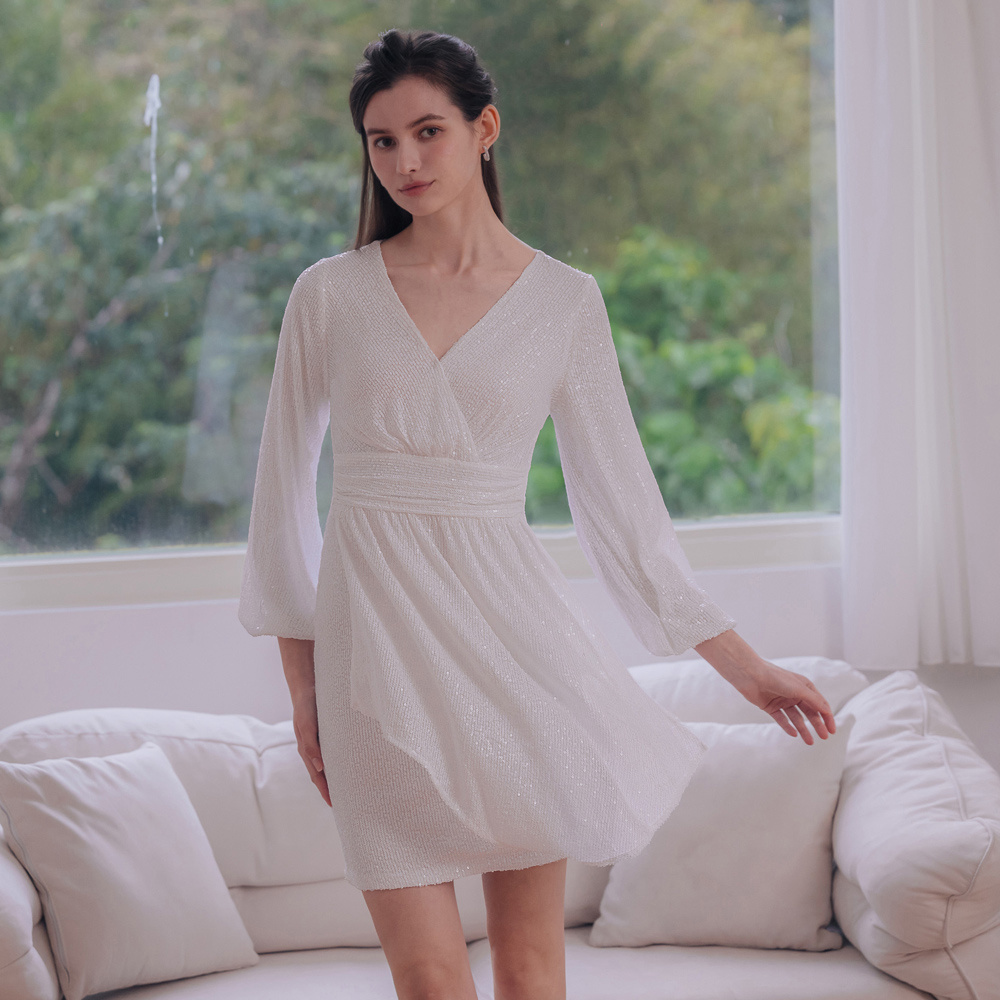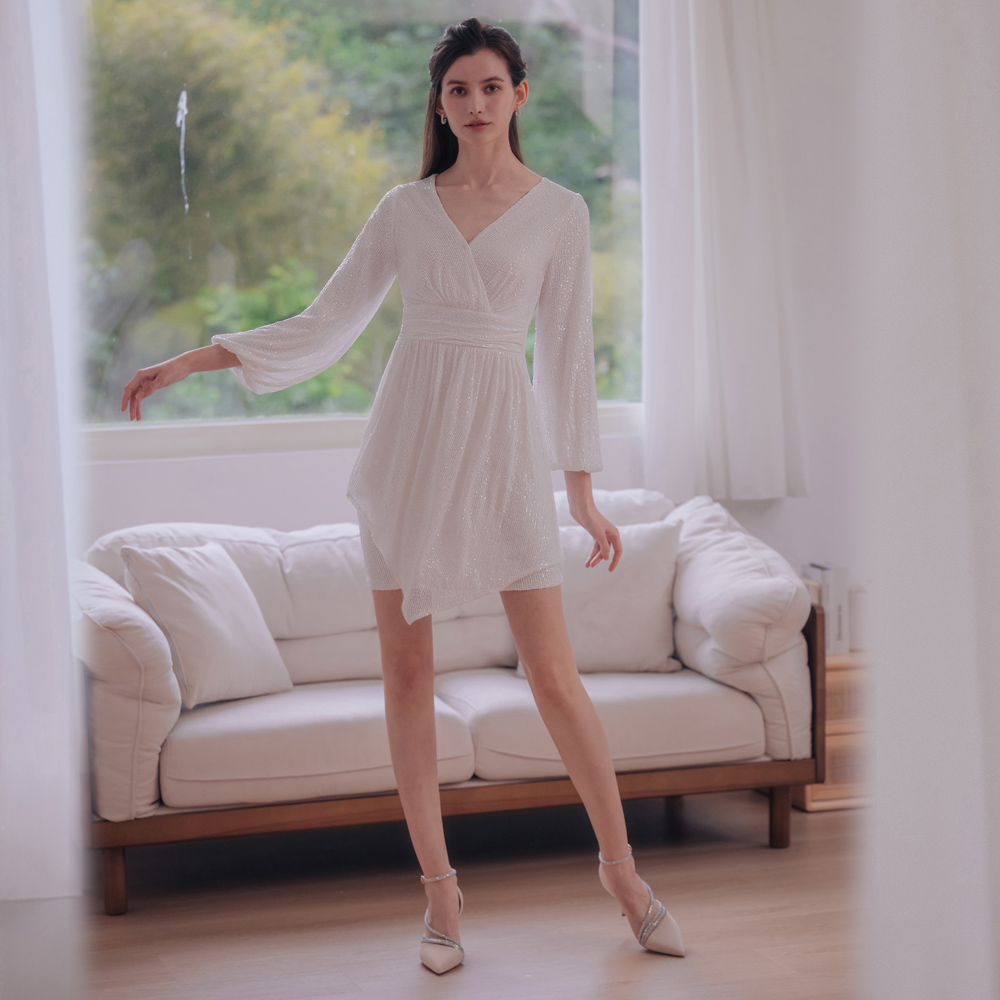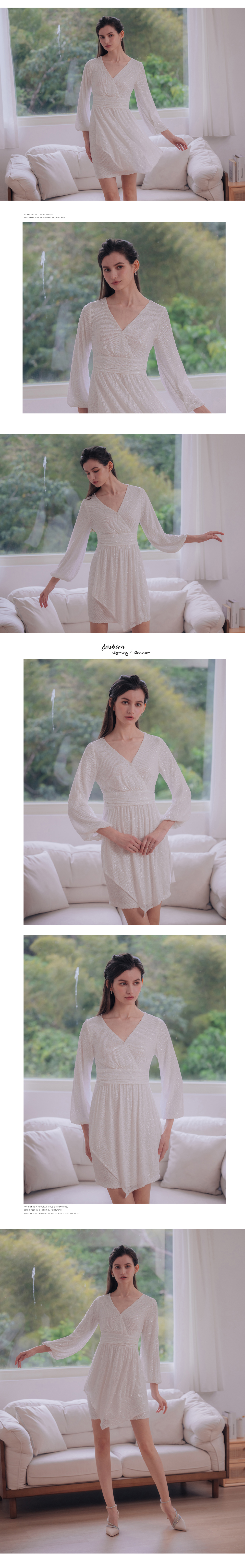 細肩帶鴕鳥毛白色短洋裝28-X094