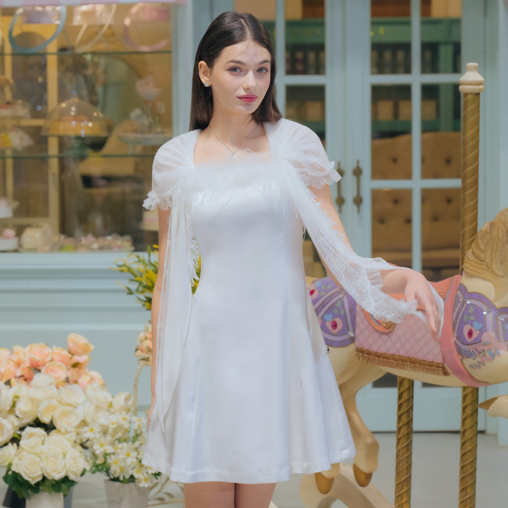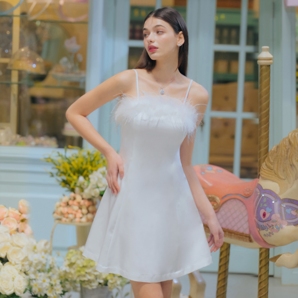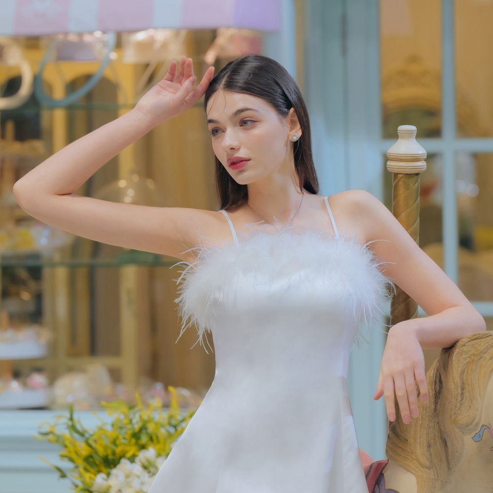 細肩帶鴕鳥毛白色短洋裝28-X094