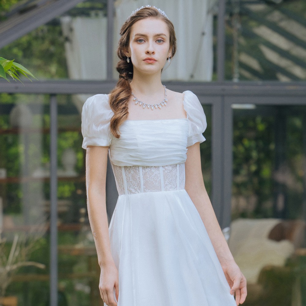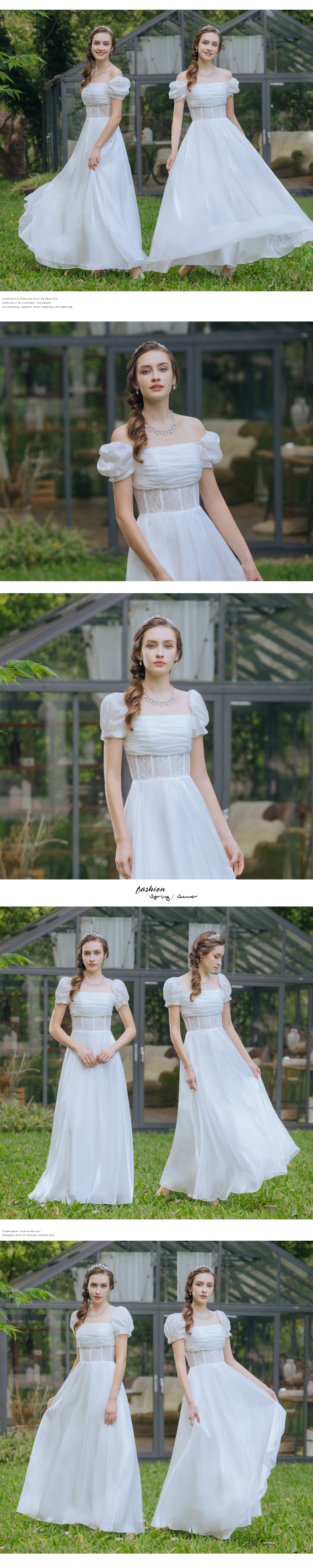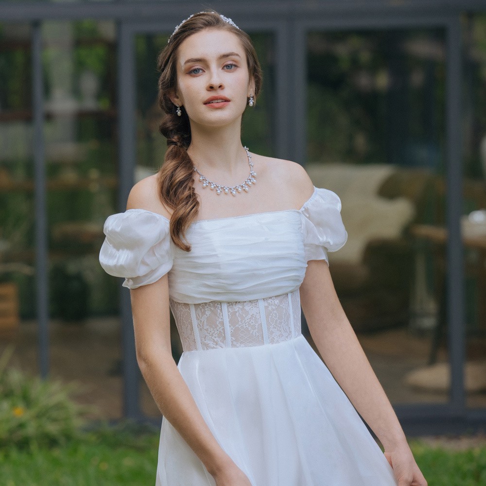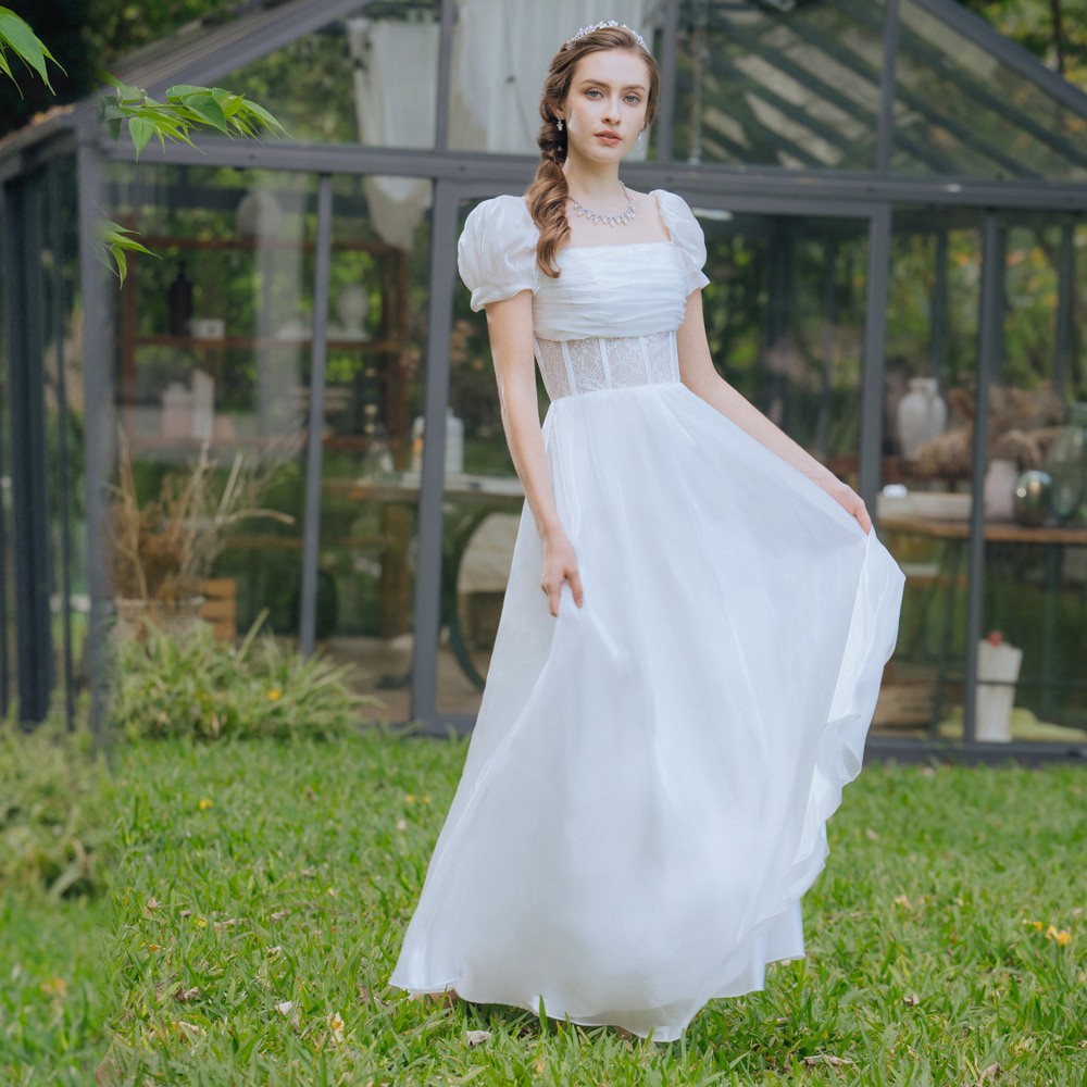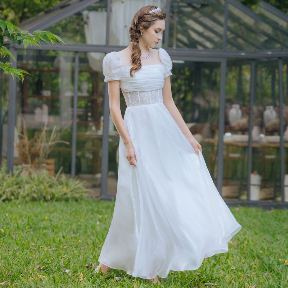一字領方領蕾絲白色長禮服19-7516