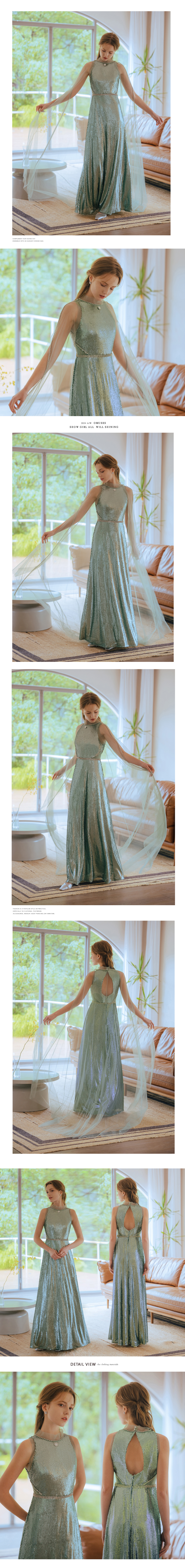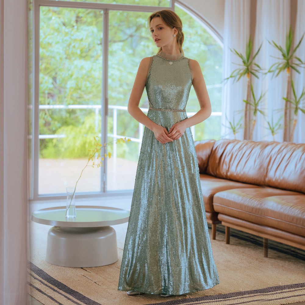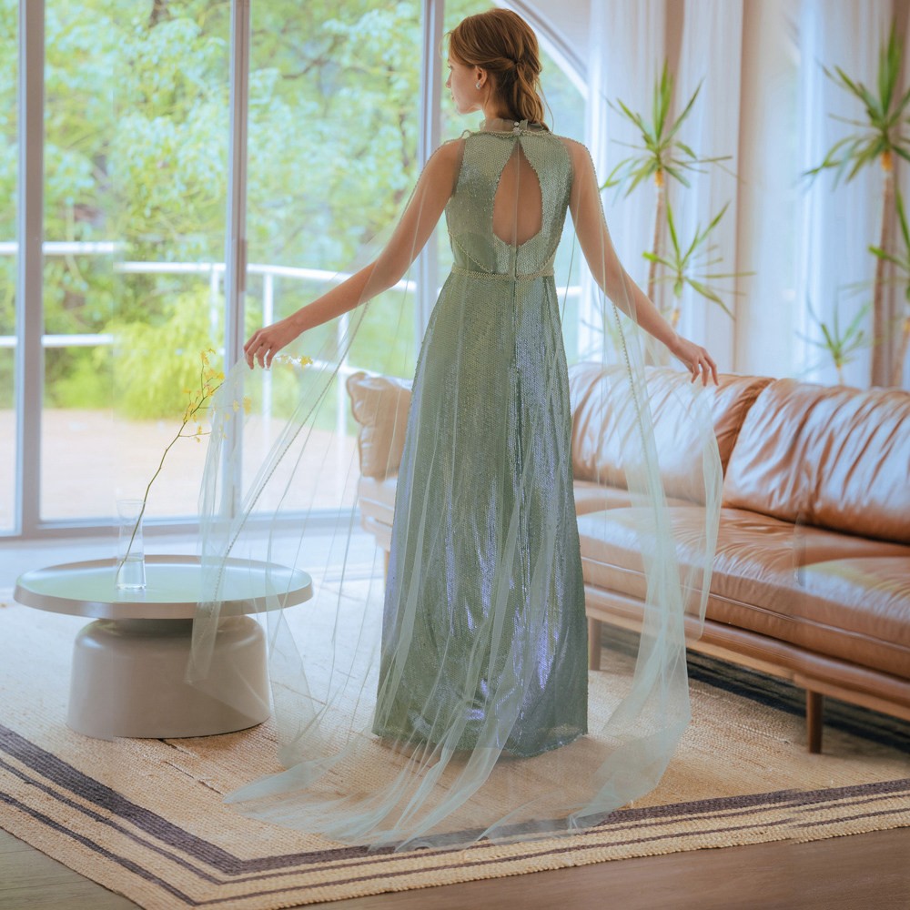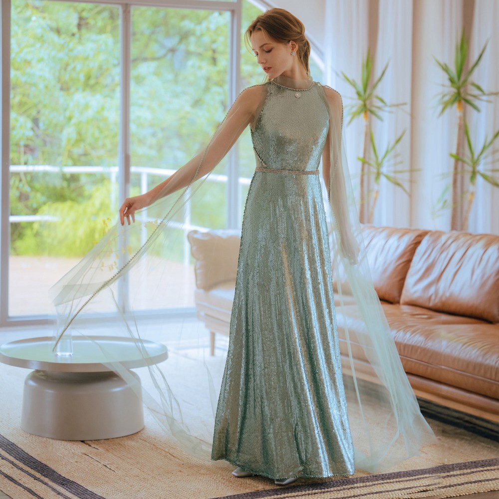 兩件式蕾絲亮片綠色長禮服19-7157