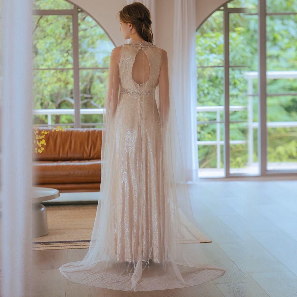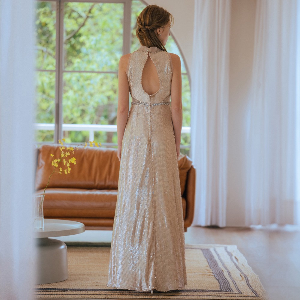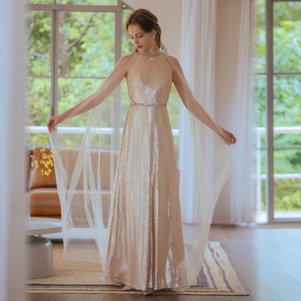 兩件式蕾絲亮片杏色長禮服19-7157