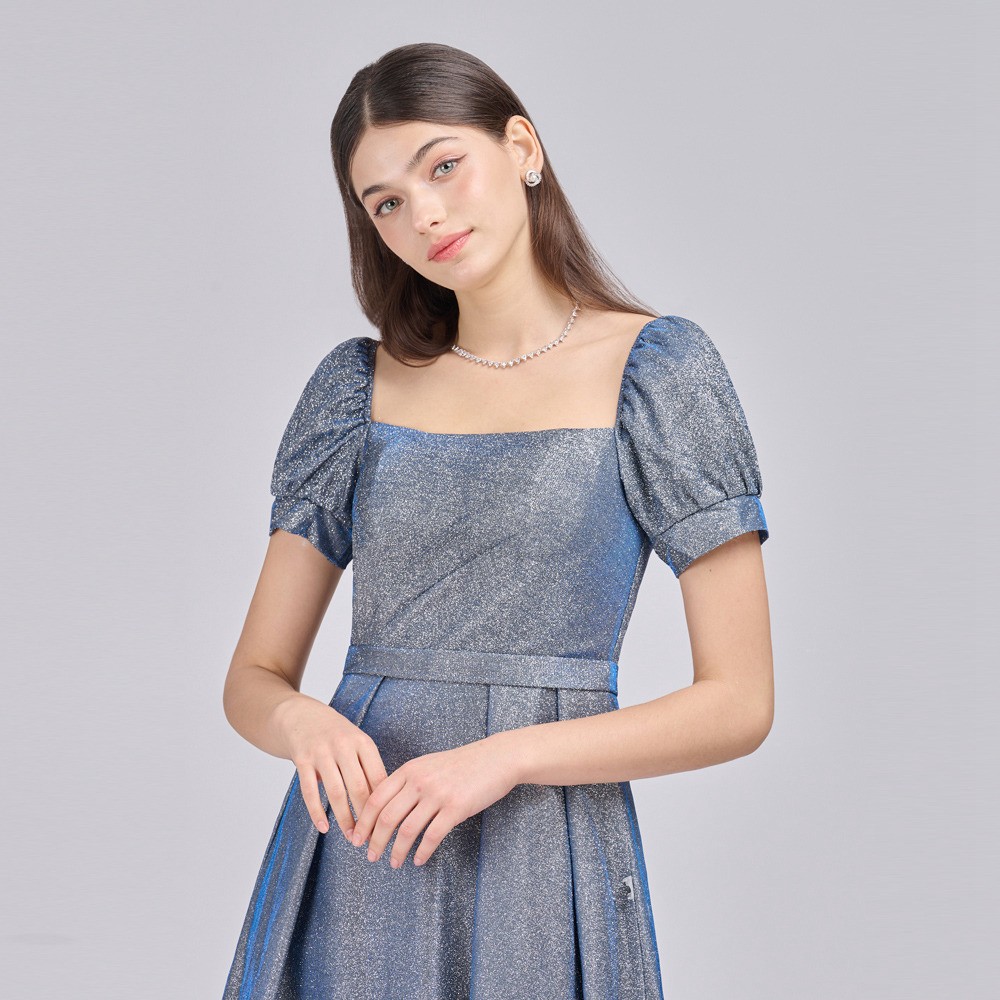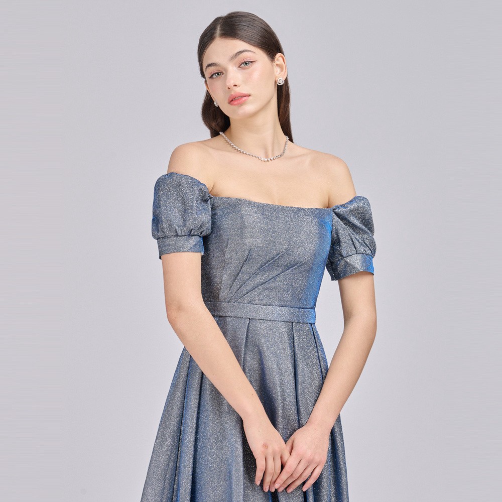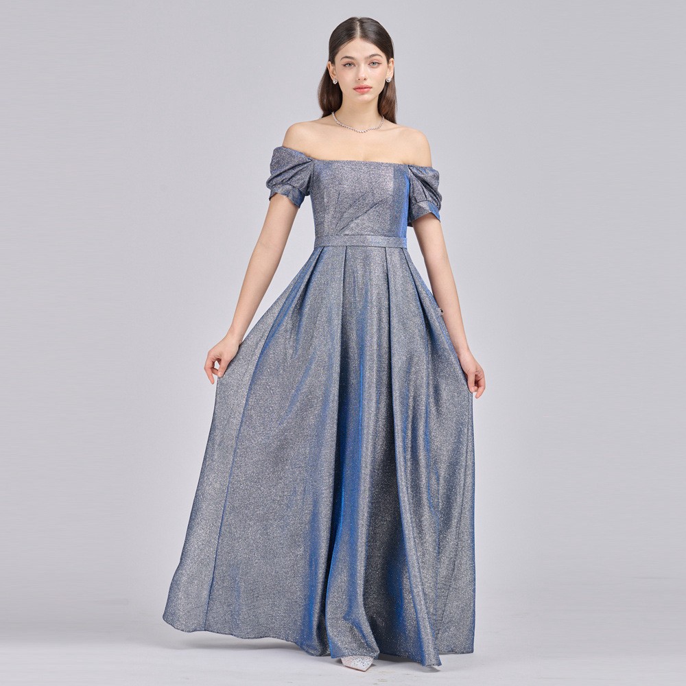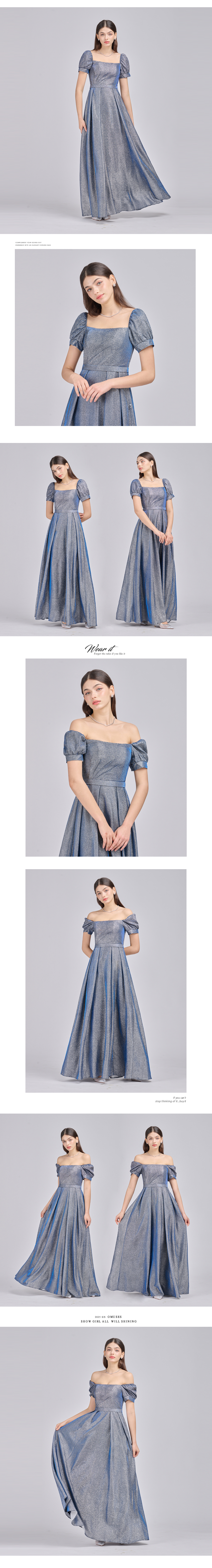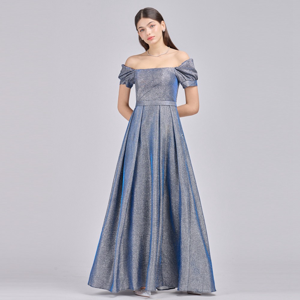 一字領方領銀蔥藍色長禮服(手工款)19-718
