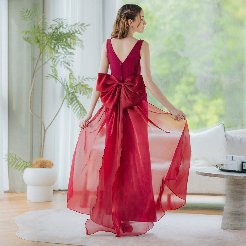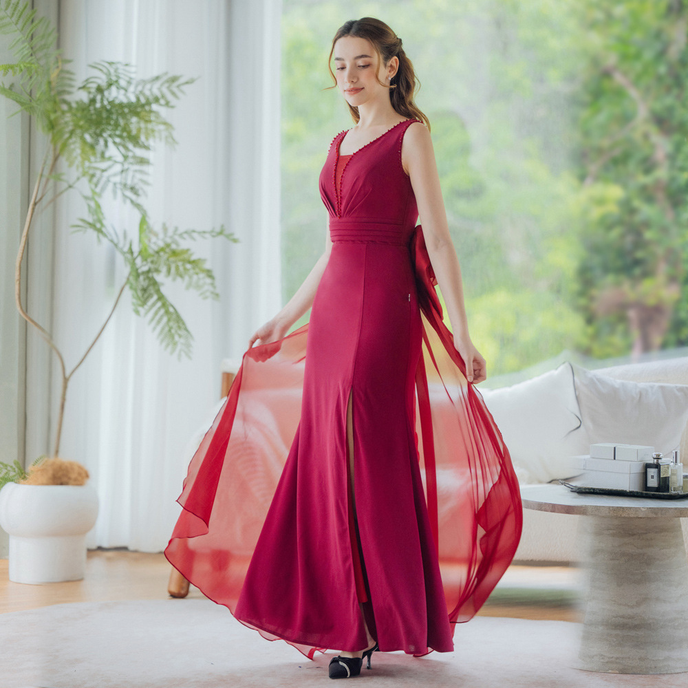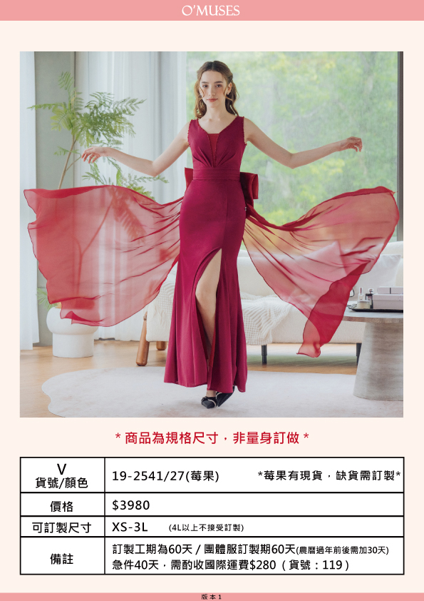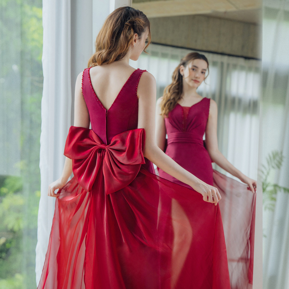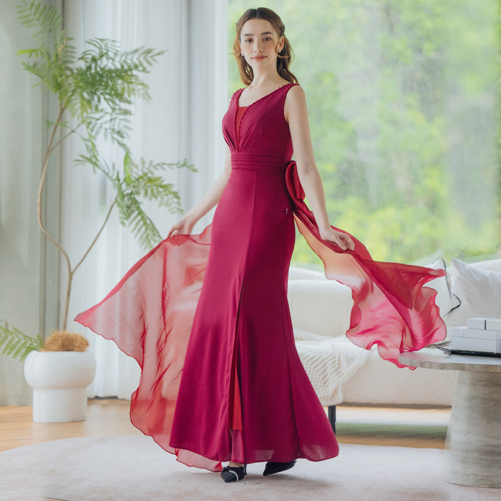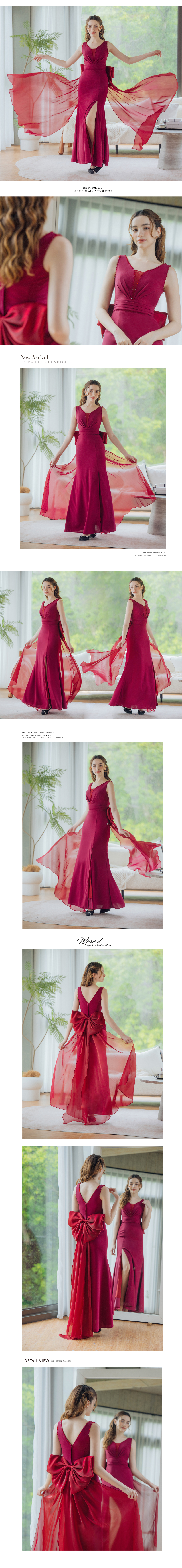 V領蝴蝶結莓果色魚尾長禮服19-2541